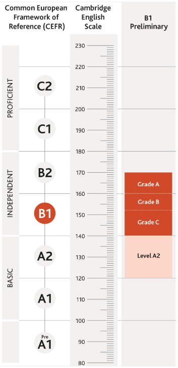 CEFR seviyeleri, Cambridge English Scale puanları ve B1 Preliminary sınavında verilen notlar arasında bir eşleştirme bulunur. Bu tablo, hangi puanın hangi seviyeye ve hangi B1 Preliminary notuna karşılık geldiğini gösterir;