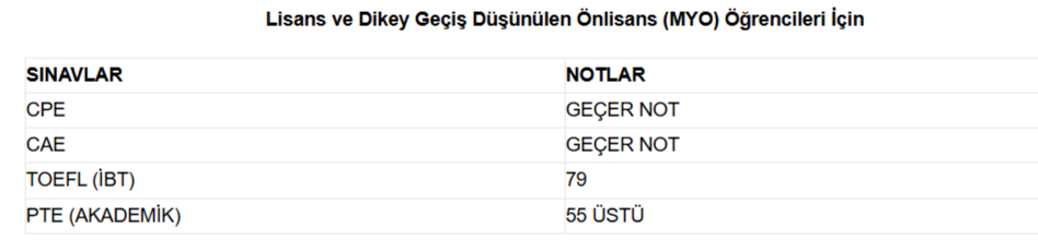 Aşağıda belirtilen ve üniversite tarafından kabul edilen uluslararası geçerliliği olan sınavlardan yeterli puanı alan öğrenciler de İngilizce Hazırlık Programı’ndan muaf sayılırlar;